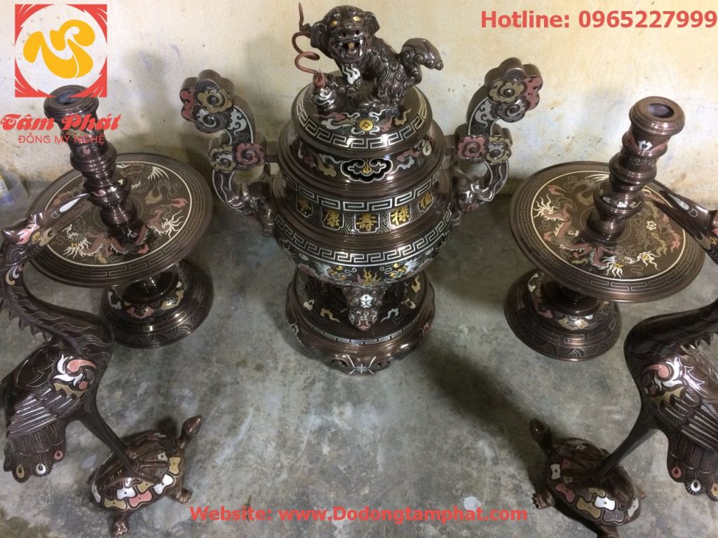 Một trong những sản phẩm đồ thờ để tạo nên bộ tam sự hay bộ ngũ sự chính là đôi chân nến bằng đồng. Đồng mỹ nghệ Tâm Phát xin giới thiệu đôi chân nến đồng đỏ khảm ngũ sắc cao cấp nhất thị trường đồng mỹ nghệ hiện nay, sản phẩm có thể kết hợp cùng đỉnh đồng để tạo thành bộ tam sự khảm ngũ sắc, hoặc đỉnh đồng và đôi hạc để tạo thành bộ ngũ sự khảm ngũ sắc cao cấp.
