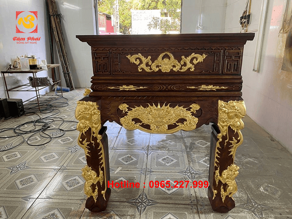 Ở mặt cạnh chính diện, các bạn có thể thấy sự hiện diện của hình ảnh cuốn thư. Đối xứng hai bên là hình đôi rồng. Chúng uốn lượn trên trời mây một cách linh hoạt, uyển chuyển. Miệng rồng há to và phun nước. Đây là một trong những quyền năng, sức mạnh của thần thú này. Ở các chân trụ, hình ảnh của những con rồng, của Kỳ Lân trèo lên cao vô cùng truyền cảm. Chúng được khắc họa sinh động, mang lại linh khí dồi dào. Ngoài ra, chúng ta không thể không nhắc đến hình ảnh của cánh dơi cách điệu và hoa lá. Hệ thống hoa văn trang trí trên mẫu bàn thờ này rất đa dạng, phong phú. Không những thế, tất cả đều có kết cấu phức tạp. Bằng kỹ thuật dát vàng khéo léo, người nghệ nhân đã đảm bảo tính sinh động của đường nét. Thêm vào đó, chúng đều đảm bảo tạo hình nguyên mẫu!Dát vàng 999 bàn thờ gỗ và hiệu ứng sắc màu