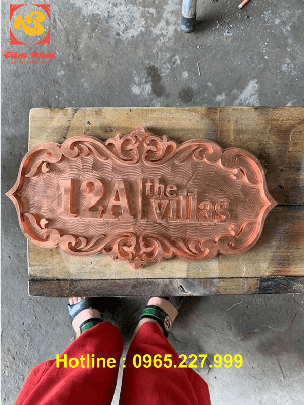 Ngoài biển chức danh, biển phòng thì chúng tôi còn chế tác cả biển số nhà. Ở đây, chúng tôi đã mang đến một phong cách độc đáo cho tấm biển lắp đặt ở biệt thự. Nó được chạm nổi dòng chữ “12A the villas”. Cách thức trình bày được cách điệu để tạo điểm nhấn. Hình dáng của tấm biển tựa như một đôi cánh thiên thần. Từ điểm chính giữa, các bạn có thể thấy những đường viền rẽ sang hai bên. Khung viền uốn lượn uyển chuyển mềm mại cùng những cành lá đầy sức sống. Tấm biển có màu mộc của đồng đỏ.Cổng đồng nhà chùa đẹp tôn nghiêm