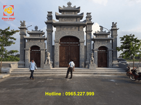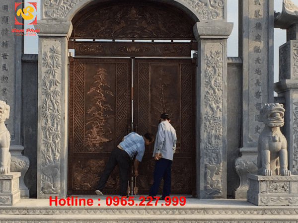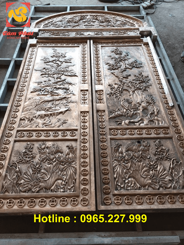 Cổng chùa tam quan càng thêm phần uy nghiêm với những cánh cổng. Tác phẩm được chạm hình cây cúc, cây mai, họa tiết song long chầu nguyệt, hồ sen. Thêm vào đó là đường viền hình đồng xu. Chưa kể đến hoa văn hình học đan cài nhịp nhàng. Chúng vừa đẹp mắt, vừa có ý nghĩa may mắn và nhân văn. Điển hình như đôi rồng chầu mặt nguyệt thể hiện mong ước mưa thuận gió hòa, trời đất êm ả, muôn nơi được hưởng hạnh phúc ấm no. Để nâng cao khả năng chống ăn mòn cho bộ cổng trước nắng mưa, quý khách có thể lựa chọn cả hình thức dát vàng, mạ vàng.Điểm khác biệt của Đồng mỹ nghệ Tâm Phát