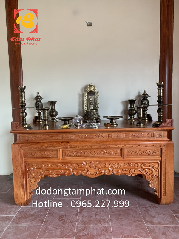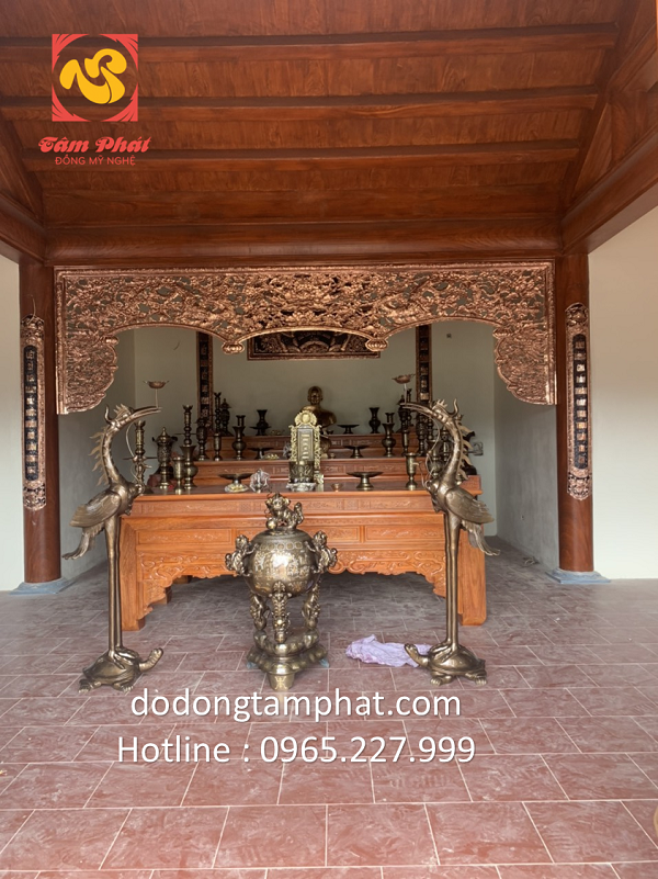 Trên tấm bài vị có đề dòng chữ : “Tưởng Nhớ Các Vị Anh Hùng”. Phía bên trên có biểu tượng vầng nguyệt tỏa sáng. Chân nến thờ được cách điệu bắt mắt. Miệng nến giống như đóa sen đang xòe nở. Đèn thờ chia thành hai loại. Trong đó, loại cỡ nhỏ bày bàn thờ. Loại cỡ lớn mang kiểu dáng mái chùa, trên đỉnh có búp sen. Sản phẩm được kết hợp với dây cắm điện, vô cùng tiện ích. Đỉnh đồng thất lân vờn cầu, đỉnh tai mây Phúc Lộc Thọ Khang Ninh cũng mang đến sự tôn nghiêm. Ngoài ra, chúng ta không thể không nhắc đến cặp hạc chầu cỡ lớn. Ở đây, hạc thờ bằng đồng đứng trên mai rùa. Chúng ngẩng cao đầu, miệng ngậm cành sen.Sắc thái sang trọng của đồ thờ bằng đồng cao cấp
