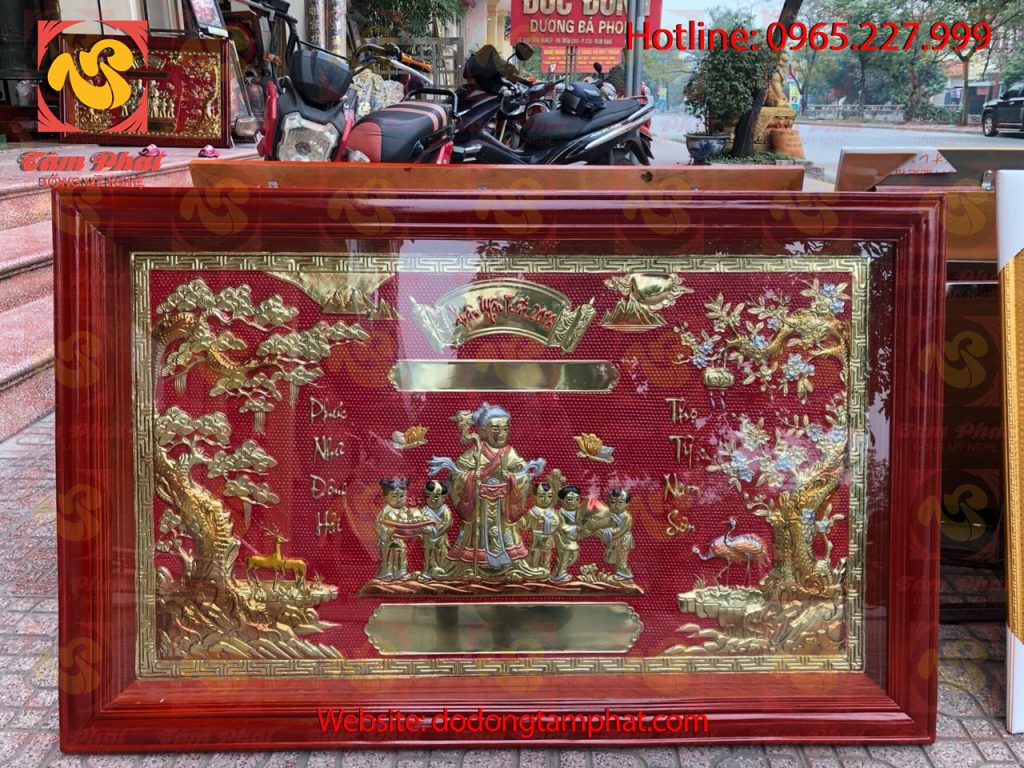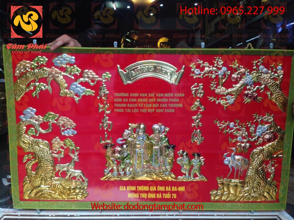Tranh mừng thọ bằng đồng được sử dụng rộng rãi trong dịp Tết Nguyên Đán, trong ngày mừng thọ ông bà, cha mẹ. Đồng mỹ nghệ Tâm Phát xin giới thiệu một số tranh đồng mừng thọ cao cấp được sản xuất thủ công tỉ mỉ tại làng nghề truyền thống Vạn Điểm, Ý Yên, Nam Định. Tên gọi sản phẩm: Tranh mừng thọ bằng đồng Chất liệu: Đồng nguyên chất cao cấp, đúc nguyên khối Kích thước: 70cm* 1m2, 55cm*80cm, 80cm*1m55 Ngoài ra Đồng mỹ nghệ Tâm Phát sản xuất các kích thước khác nhau tùy theo nhu cầu của khách hàng Màu sắc: Đồng được chạm khắc nổi trên nền đỏ Quy trình sản xuất: