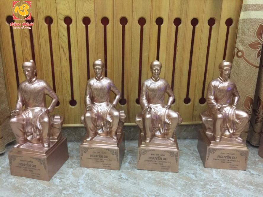 Nhắc đến Truyện Kiều nổi tiếng của văn học Việt Nam, chúng ta không thể nào không nhắc tới Đại Thi Hào dân tộc – Nguyễn Du. Người để lại cho nền văn học dân tộc và nhân loại một tác phẩm còn giá trị nhân văn đến ngàn đời. Cũng chính vì vậy, mặc dù Nguyễn Du đã ra đi nhưng hình ảnh, những bức tượng về người vẫn còn mãi. Tâm Phát xin giới thiệu tượng đồng Đại Thi Hào Nguyễn Du bằng đồng đỏ cao cấp. Tên gọi sản phẩm: Tượng Đại Thi Hào Nguyễn Du bằng đồng đỏ cao cấp Chất liệu: Đồng đỏ nguyên chất nhập khẩu đúc liền khối Sản phẩm có thể được mạ vàng cao cấp 24K hướng đến sự tinh tế và trang trọng Kích thước: 50 cm Ngoài ra Đồng mỹ nghệ Tâm Phát sản xuất các kích thước khác nhau tùy theo nhu cầu của khách hàng Màu sắc: Màu chủ đạo là màu đồng đỏ Quy trình sản xuất: Tạo khuôn Rấp khuôn Đổ đồng Làm nguội Hoàn thiện Chi tiết sản phẩm: Sản phẩm được đúc thủ công tại xưởng đúc đồng và xưởng mạ vàng của Đồng mỹ nghệ Tâm Phát. Tương Đại Thi Hào Nguyễn Du mang thần thái của một nhà hiền triết anh minh kì tài. Bức tượng là hình Nguyễn Du đang ngồi, bên tay phải là một cây bút trong tư thế cầm sẵn để sáng tác thơ ca hội họa. Bức tượng tao nhã toát lên dáng vẻ thanh thoát mà anh minh, sáng suốt. Tượng Đại Thi Hào Nguyễn Du được sử dụng rộng rãi tại gia đình, cơ quan, tổ chức…hoặc làm quà tặng, quà biếu, đồ thờ… Hình ảnh sản phẩm